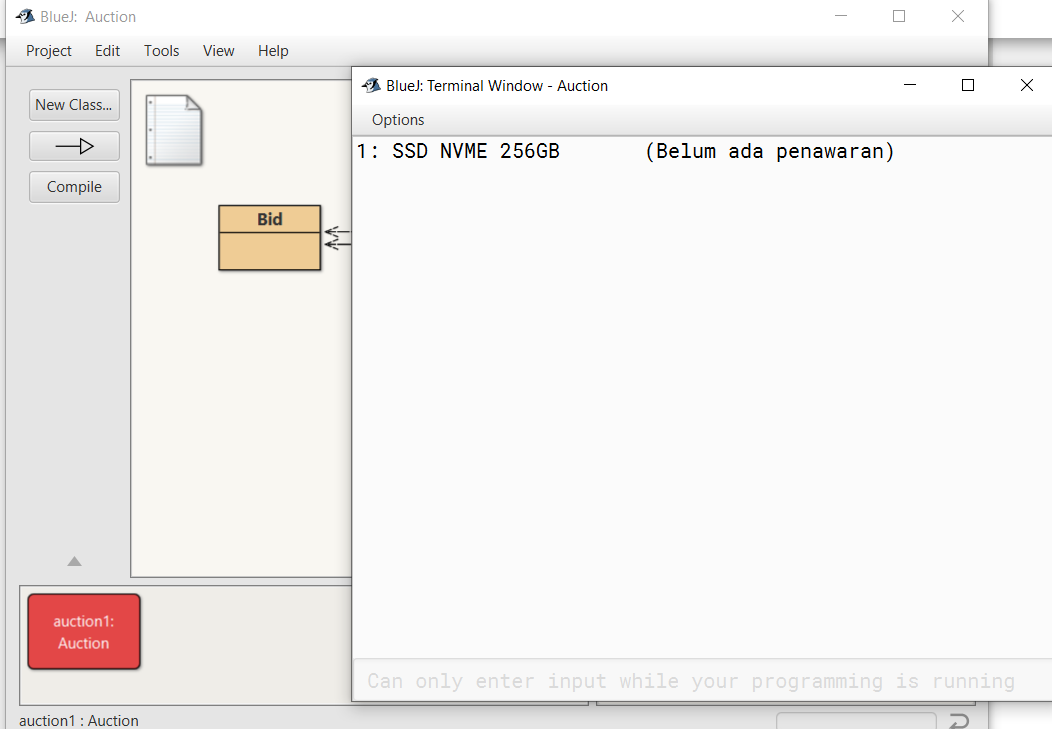 - Sebelum dapat melakakukan penawaran, kelas Person perlu dinstansiasi. Klik kanan pada kelas Person dan pilih menu new Auction, anda akan diminta nama dari klien kita dan nama object dari kelas Person yang kita instansiasi.